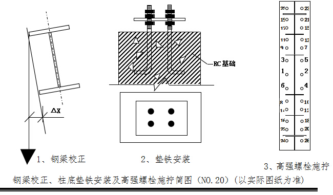 通用预制结构施工方案二(四)、钢梁的吊装与校正 ● 钢梁构件运到现场,先应拼装。钢梁扶正需要翻身起板时采用两点翻身起板法,人工用短钢管及方木临时辅助起板。钢梁翻身就位后需要进行多次试吊并及时重新绑扎吊索,试吊时吊车起吊一定要缓慢上升,做到各吊点位置受力均匀并以钢梁不变形为最佳状态,达到要求后即进行吊升旋转到设计位置,再由人工在地面拉动预先扣在大梁上的控制绳,转动到位后,即可用板钳来定柱梁孔位,同时用高强螺栓固定。并且第一榀钢梁应增加两根临时固定揽风绳,第二榀后的大梁则用屋面檀条或连系梁加以临时固定。(简要示意图详见:图表No.18)。 ● 在吊装钢梁时还须对钢柱进行复核,此时一般采用葫芦拉钢丝绳缆索进行调整,待大梁安装完后方可松开缆索。对钢梁屋脊线也必须控制。使屋架与柱两端中心线等值偏差,这样各跨钢屋架均在同一中心线上。 (五)、柱底板垫块安装及二次灌浆 ● 钢柱安装时,因需调整柱高程、通常于柱底端头板下放置垫块,而垫块的尺寸,一般只考虑承载钢架本身的重量。基础砼面的高程与柱底板高程间两者之差即为所需加垫块的厚度,由此可计算出所需垫块的数量。柱底垫块应包括6 mm垫铁或锲形垫铁,锲形垫铁垫到柱底板角。 ● 主钢构吊装校正完成后,才可进行灌浆通常在校正完毕后三天内完成,以免因其他原因造成结构体移位,灌浆材料应采用细石膨胀混凝土,使柱底板与基础完全接触,灌浆砼标号比柱砼标号高一级。灌浆前准备工作,削除砼表面过高处使灌浆厚度至少保持4cm以上,去除砼表面的细微物,油脂、泥土等不良物质,而保持适当粗糙。一端及两侧而之模板亦需高出板面,且留出间隔,并稍具倾斜,以使插入木棒或钢筋。灌浆料必须以拌和机拌和,若以手拌和,则缺乏流动性而使水易增加,造成收缩之危险。一经灌注,必须连续不断进行作业,直到灌浆从周围出为止,灌浆料必须从一侧开始,未完成前不可中断。灌注后,保持湿润状态保养至少七天。 (六)、高强度螺栓施工方法 ● 该钢结构工程钢梁、柱连接采用大六角高强螺栓,安装高强螺栓时构件的磨擦面应保护干燥清洁,不得在雨中作业。拧紧顺序应从节点板中心向边缘施拧(参考图表No.5-H),两个连接件的顺序为先主要后次要的顺序,H型钢构件为上翼缘、下翼缘、复板的顺序,同一节柱上梁、柱节点紧拧顺序为先上梁柱接点再下梁柱节点,最后为中间梁柱节点。高强螺栓紧固程度用扭矩扳手进行控制。其外露丝扣为2-3丝,连接檩条墙梁用的普通螺栓每个螺栓垫两个垫圈。所有安装螺孔,均不得采用气割扩孔,当板叠销孔超出允许偏差造成连接螺栓不能穿通时,可用铰刀进行修整,但修整后的最大直径应小于螺栓直径的1.2倍,铰孔时应防止铁屑落入板叠缝隙。同时本工程所有规格的高强螺栓经监理见证取样后送试验室试验。 ● 该工程拟编制一个班组6人专门负责高强度螺栓施工,其中螺栓安装4人,初拧2人,终拧2人,并必须做到当天安装的螺栓应在当天终拧完毕。 (七)、焊接方法及焊接材料要求 ●必要时现场将搭设临时防风、防雨棚,以改善因风、雨等自然环境所造成的影响。 ●选用适当的电焊机、碳弧气刨、稳压器及焊接辅助装置如干燥箱、保温筒等,确保焊接所需的装备完整,能满足质量保证的需要,焊前焊条必须烘干处理。 ●提供合格的焊接工人及探伤工程师,所有焊工均必须持证上岗,所有对接焊缝均必须探伤,焊缝等级应达到设计要求。 ●焊接方法和焊接材料选择 根据工程结构焊接接点位置,现场焊接施工采用手工焊相结合的焊接方法,焊接材料根据结构钢材的材质,现场焊接采用手工电弧焊,焊接材料为:E4303或E506焊条,,定位焊用手工电弧焊进行。打底焊用φ3.2的焊条,填充及盖面焊用φ4.0的焊条进行。(如天气较湿,需进行电焊条烘烤)按表选择: ●结构焊接施工顺序 焊接施工顺序对焊接变形及焊后残余应力有很大影响,在焊接时为尽量减少结构焊接后的变形和焊后残余应力,结构焊接应尽量实行对称焊接,让结构受热点在整个平面内对称、均匀分布,避免结构因受热不均匀而产生扭曲和较大焊后残余应力。 ●焊接顺序要求 ①总体原则:任一构件焊接尽可能按排双数焊工进行对称施焊,为最大限度地避免焊接应力导致构件变形,应先施焊完整个结构节点的打底焊,再施焊整个结构节点的填充焊,最后施焊节点的盖面焊,使各层应力有一个自由释放的过程。 ②在施焊前要求焊工先检查工装胎架是否对结构件进行了有效定位,结构两端是否有保型装置,并且做好防风、抗雨、保温等各项焊前准备工作,在施焊过程中尽可能使用一种焊接方法进行施焊,以减少焊接能量不同引起的附加焊接应力。 ●焊缝质量检验要求: ①本工程二层梁柱、梁梁之间对接焊缝为二级焊缝,焊缝焊好24小时后进行20%的超声波无损探伤,评定等级Ⅲ级。其它部位的焊缝为角焊缝,三级焊缝。不进行探伤试验。 ●焊接工艺评定方案 ●焊接工艺评定要求 ①焊接工艺评定根据《钢结构工程施工质量验收规范》规定,按《建筑钢结构焊接规程》、施工图技术要求进行。 ②焊接工艺评定之前应根据钢结构工程节点形式提出相应的焊接工艺评定指导书,用来指导焊接工艺评定试验(已做过的焊接工艺评定试验,经工程监理确认后可免做或替代)。焊接工艺评定试验经